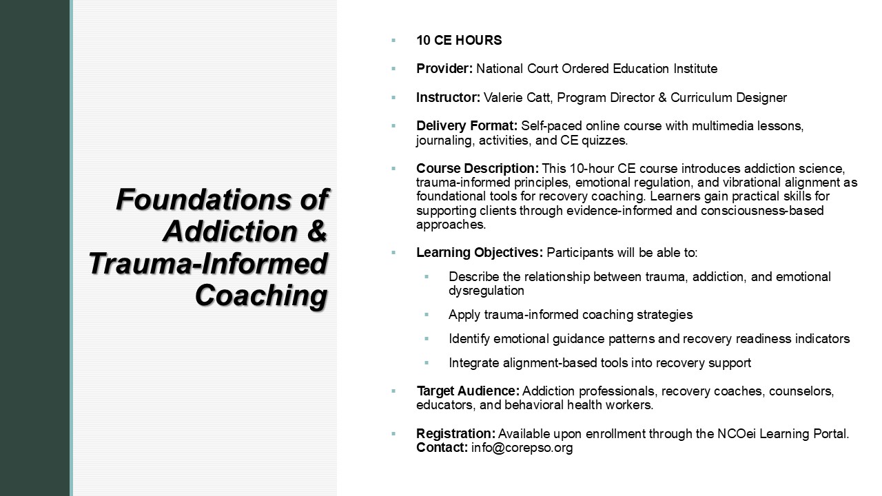 Courts, clinicians, coaches, and self‑paced learners all want to see themselves reflected. Examples: Individuals seeking trauma-informed addiction education; Professionals earning CE credits; /Court-referred participants needing structured support; Coaches wanting evidence‑aligned tools
