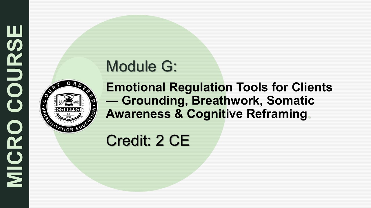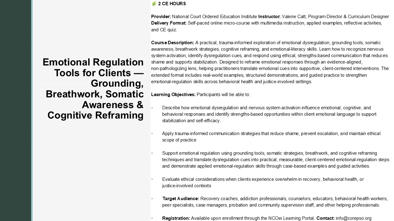 🌿 Advanced Course Overview (2 CE Hours) Grounded in trauma‑informed practice, this extended micro‑course examines how clients experience and express emotional dysregulation, nervous system activation, and stress‑linked emotional patterns. The course explores how dysregulation shows up in real‑world behavioral health, recovery, and justice‑involved settings — and how professionals can respond using ethical, strengths‑based, and non‑pathologizing strategies. Participants learn to translate emotional cues, activation patterns, and overwhelm behaviors into clear, supportive interventions that promote stabilization, emotional clarity, and client autonomy. The expanded 2‑hour format includes deeper case examples, guided reflection, grounding demonstrations, breathwork practice, and applied scenario‑based exercises to strengthen real‑world emotional‑regulation skills. Learners gain practical tools for supporting nervous system regulation, teaching accessible coping strategies, and maintaining ethical scope while honoring client dignity and lived experience. 🎯 Learning Objectives (NAADAC Aligned) By the end of this 2‑hour micro‑course, participants will be able to: Describe how emotional dysregulation, nervous system activation, and stress‑linked patterns influence emotional regulation, cognitive processing, and behavioral responses. Identify strengths‑based opportunities within client emotional language to support stabilization, motivation, and self‑efficacy. Apply trauma‑informed, person‑centered communication strategies that reduce shame, prevent escalation, and maintain ethical scope of practice. Support emotional regulation using grounding tools, somatic strategies, breathwork, movement‑based stabilization, and cognitive reframing techniques. Translate dysregulation cues into practical, measurable, client‑centered emotional‑regulation steps that promote safety and emotional clarity. Demonstrate applied emotional‑regulation skills through case‑based scenarios, including ethical decision‑making and scope‑aligned intervention planning.