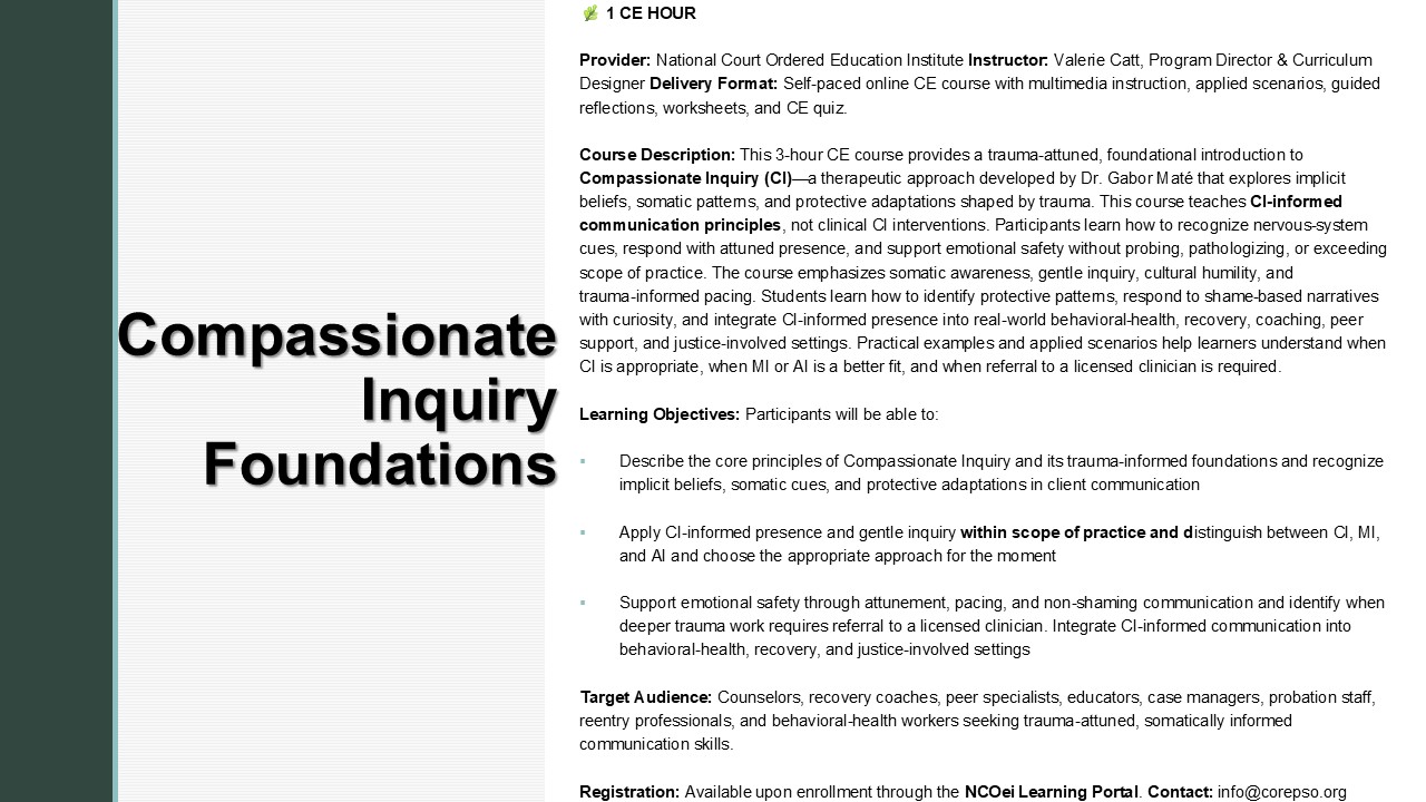 🌿 Course Overview: 1 CE Hour Grounded in trauma‑informed practice, this foundational 1‑CE course introduces helping professionals to Compassionate Inquiry (CI)—a trauma‑attuned, somatically informed approach that helps uncover implicit beliefs, protective adaptations, and nervous‑system patterns shaping client behavior. Participants learn CI‑informed presence, attunement, gentle inquiry, and scope‑appropriate strategies for supporting emotional safety without probing, pathologizing, or exceeding professional boundaries. Through concise multimedia instruction, applied examples, and structured practice, learners gain practical tools for recognizing somatic cues, responding to shame‑based narratives with curiosity, and supporting clients in moments of dysregulation or protective activation. The course emphasizes ethical boundaries, cultural humility, trauma‑informed pacing, and communication strategies that strengthen rapport across behavioral health, coaching, recovery, peer support, and justice‑involved settings. 🎯 Learning Objectives (NAADAC Aligned) By the end of this 1‑CE course, participants will be able to: • Describe the core principles and trauma‑informed foundations of Compassionate Inquiry • Recognize implicit beliefs, somatic cues, and protective adaptations in client communication • Apply CI‑informed presence, attunement, and gentle inquiry within scope of practice • Distinguish CI from MI and AI and choose the appropriate approach for the moment • Support emotional safety through pacing, curiosity, and non‑shaming communication • Demonstrate understanding of course concepts through applied activities and a CE quiz assessing comprehension and integration