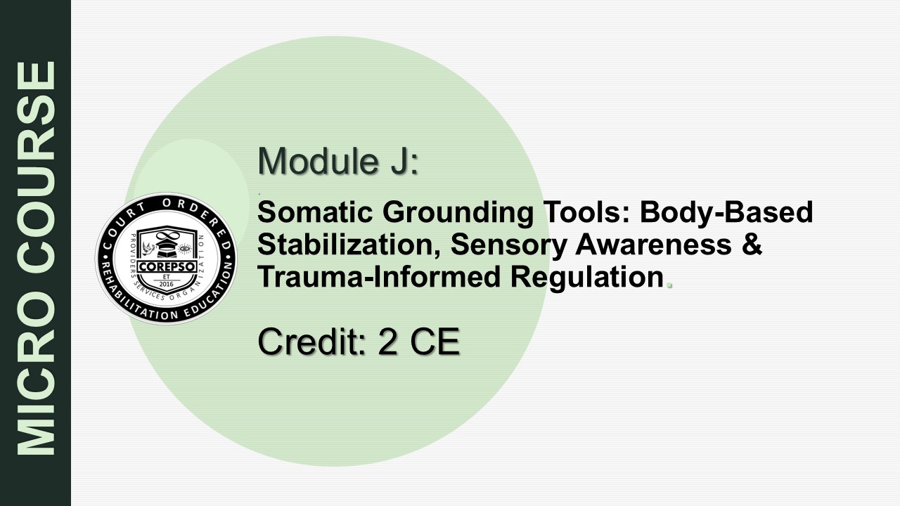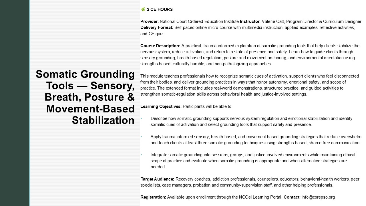 🌿 Course Overview (2 CE Hours) Grounded in trauma‑informed practice, this extended micro‑course examines how clients experience and express nervous‑system activation, somatic overwhelm, dissociation, and stress‑linked physical patterns. The course explores how activation shows up in real‑world behavioral‑health, recovery, and justice‑involved settings — and how professionals can respond using ethical, strengths‑based, and non‑pathologizing somatic‑regulation strategies. Participants learn to translate somatic cues, activation patterns, and overwhelm behaviors into clear, supportive interventions that promote stabilization, embodiment, and client autonomy. The expanded 2‑hour format includes deeper case examples, guided reflection, sensory‑grounding demonstrations, breathwork practice, posture‑based anchoring, and applied scenario‑based exercises to strengthen real‑world somatic‑regulation skills. Learners gain practical tools for supporting nervous‑system regulation, teaching accessible grounding strategies, and maintaining ethical scope while honoring client dignity and lived experience. 🎯 Learning Objectives (NAADAC Aligned) By the end of this 2‑hour micro‑course, participants will be able to: Describe how nervous‑system activation, somatic overwhelm, and stress‑linked patterns influence emotional, cognitive, and behavioral responses. Identify strengths‑based opportunities within client somatic cues to support stabilization, embodiment, and self‑efficacy. Apply trauma‑informed, person‑centered communication strategies that reduce shame, prevent escalation, and maintain ethical scope of practice. Support nervous‑system regulation using sensory grounding, somatic anchoring, breathwork, movement‑based stabilization, and environmental orientation techniques. Translate somatic activation cues into practical, measurable, client‑centered grounding steps that promote safety and presence. Demonstrate applied somatic‑regulation skills through case‑based scenarios, including ethical decision‑making and scope‑aligned intervention planning.