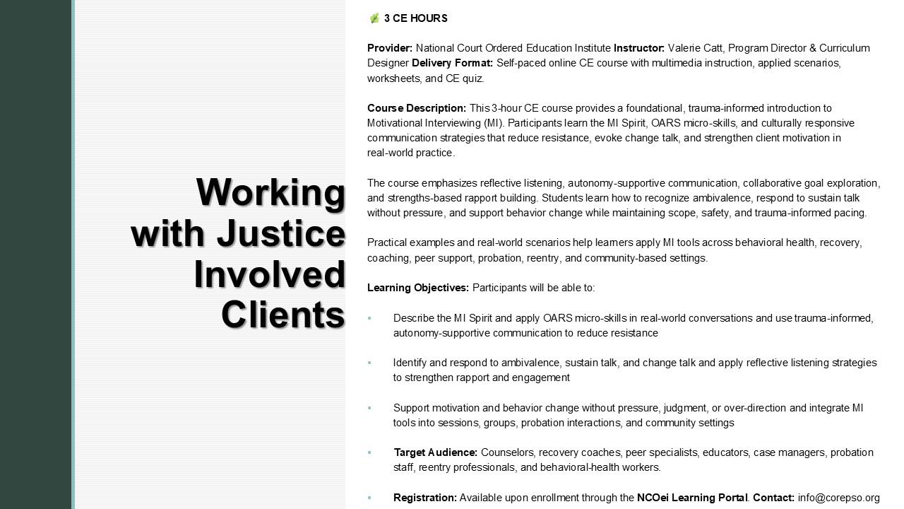 🌿 Course Overview: 3 CE Hours Grounded in trauma‑informed practice, this foundational 3‑CE course teaches professionals how to use Motivational Interviewing (MI) to strengthen engagement, reduce resistance, and support client‑led behavior change. Participants learn the MI Spirit, the OARS micro‑skills, how to recognize sustain talk vs. change talk, and how to respond to ambivalence with curiosity, collaboration, and non‑shaming communication. Through concise multimedia instruction, applied examples, and structured practice, learners gain practical tools for evoking intrinsic motivation, reinforcing commitment language, and guiding conversations that support accountability without confrontation. The course emphasizes ethical boundaries, autonomy‑supportive dialogue, and communication strategies that strengthen rapport across behavioral health, coaching, recovery, and justice‑involved settings. 🎯 Learning Objectives (NAADAC Aligned) By the end of this 3‑CE course, participants will be able to: • Describe the core spirit and principles of Motivational Interviewing • Demonstrate the OARS micro‑skills (Open questions, Affirmations, Reflective listening, Summaries) • Identify sustain talk vs. change talk in client communication • Apply MI‑aligned strategies to reduce resistance and strengthen intrinsic motivation • Use brief MI interventions appropriate for coaching, counseling, recovery, and justice‑involved settings • Demonstrate understanding of course concepts through applied activities and a CE quiz assessing comprehension and integration